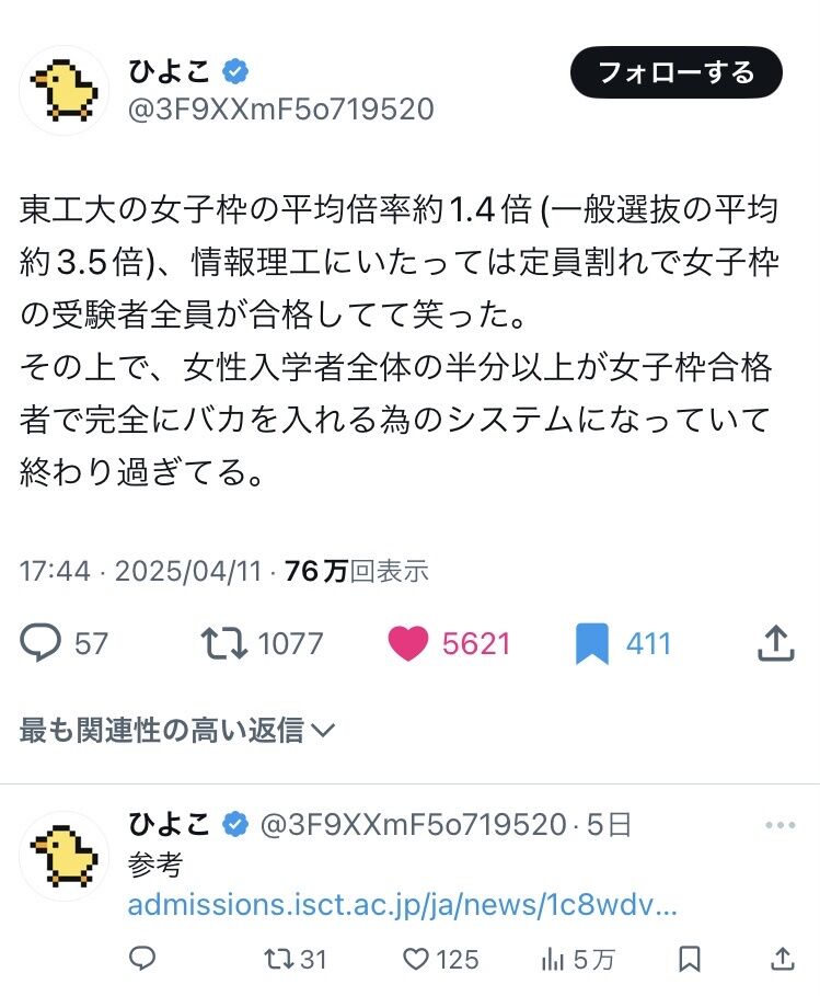 能力がない男は無能ゆえに結婚できないことを裏返すと、能力あるのに結婚もできず子供すら産めない本物の無能がいるってことなんだけど、そんなガチ*製造機でも本人の中では自分は優秀だからって自覚持ってそうなの痛々しいな