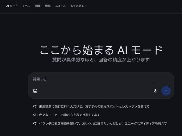 9月9日、Googleは日本のGoogle検索において、AIがより難しい質問に対応できる「AIモード」の提供を開始した。これまで英語圏ではすでに提供してきた機能だが、日本語を含む他の言語にも対応した。